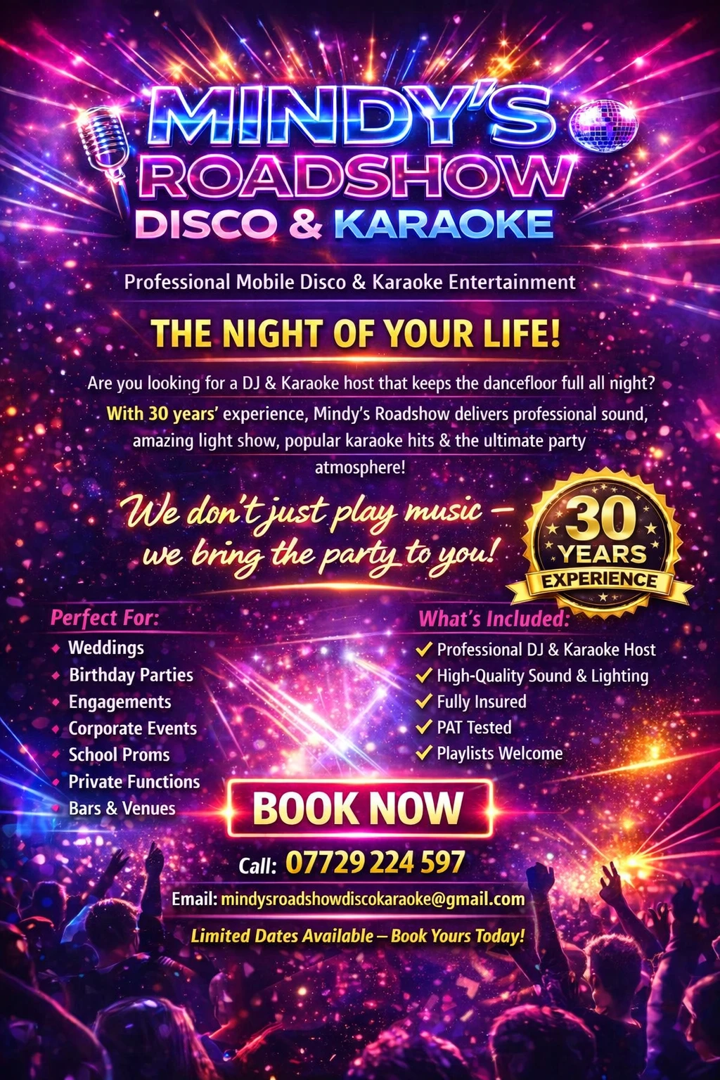 With Mindy’s Roadshow, you’re not just hiring a DJ – you’re booking a friendly, reliable entertainment service that cares about every detail.